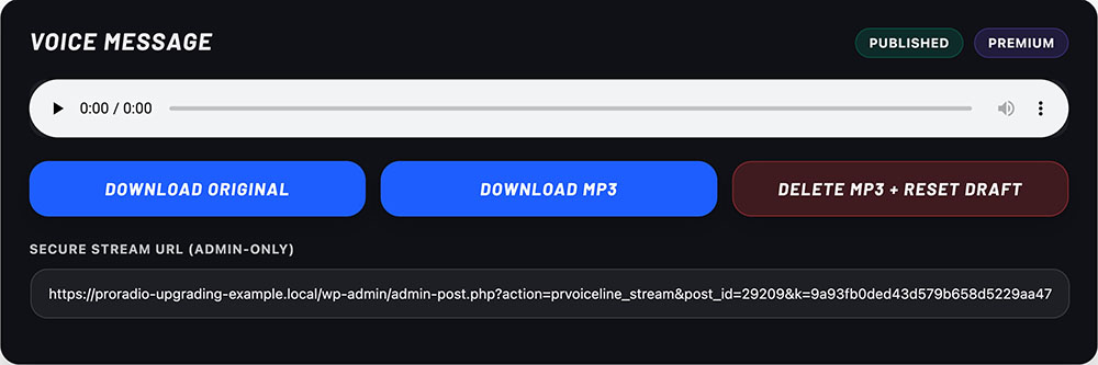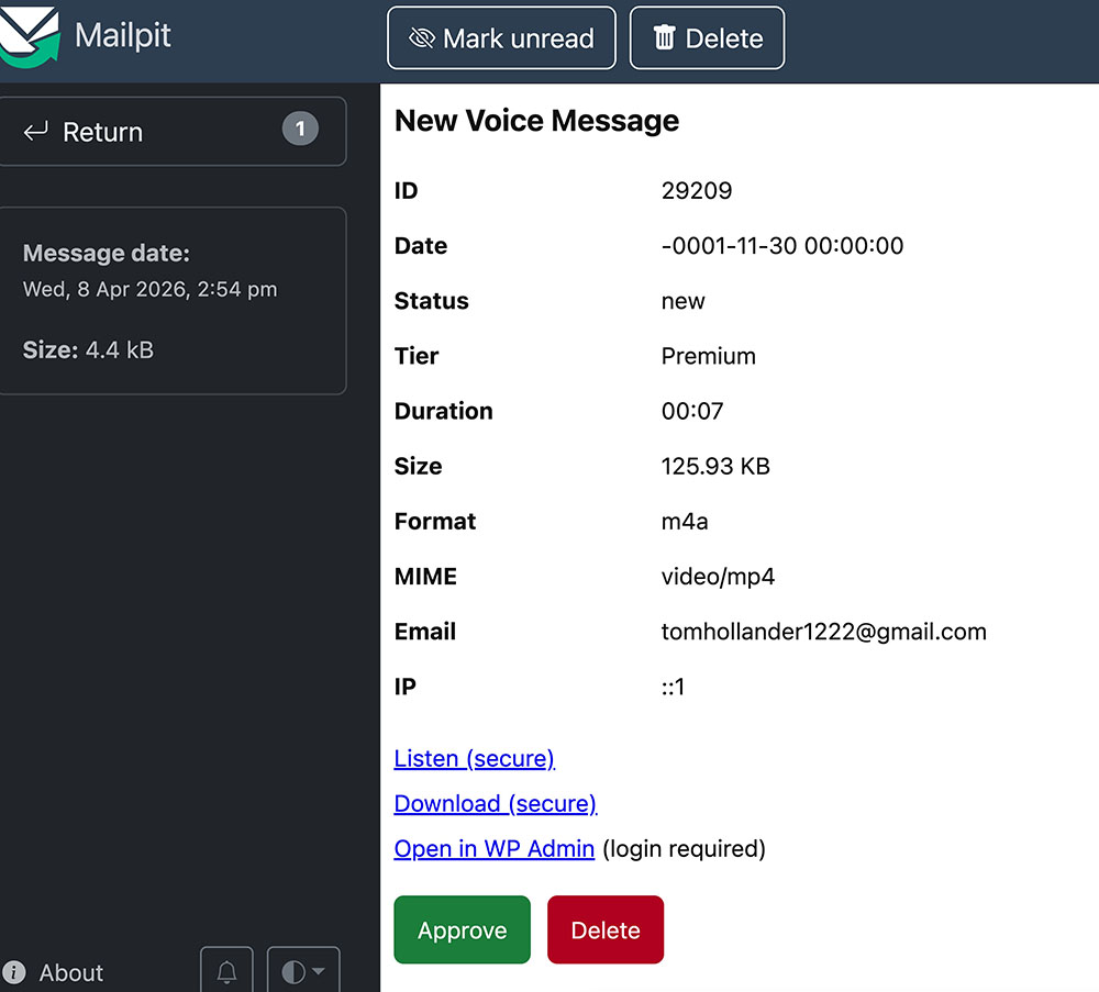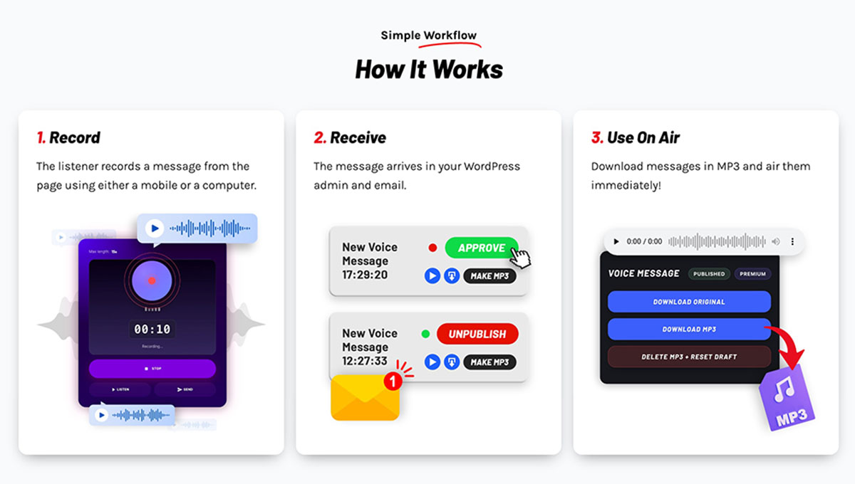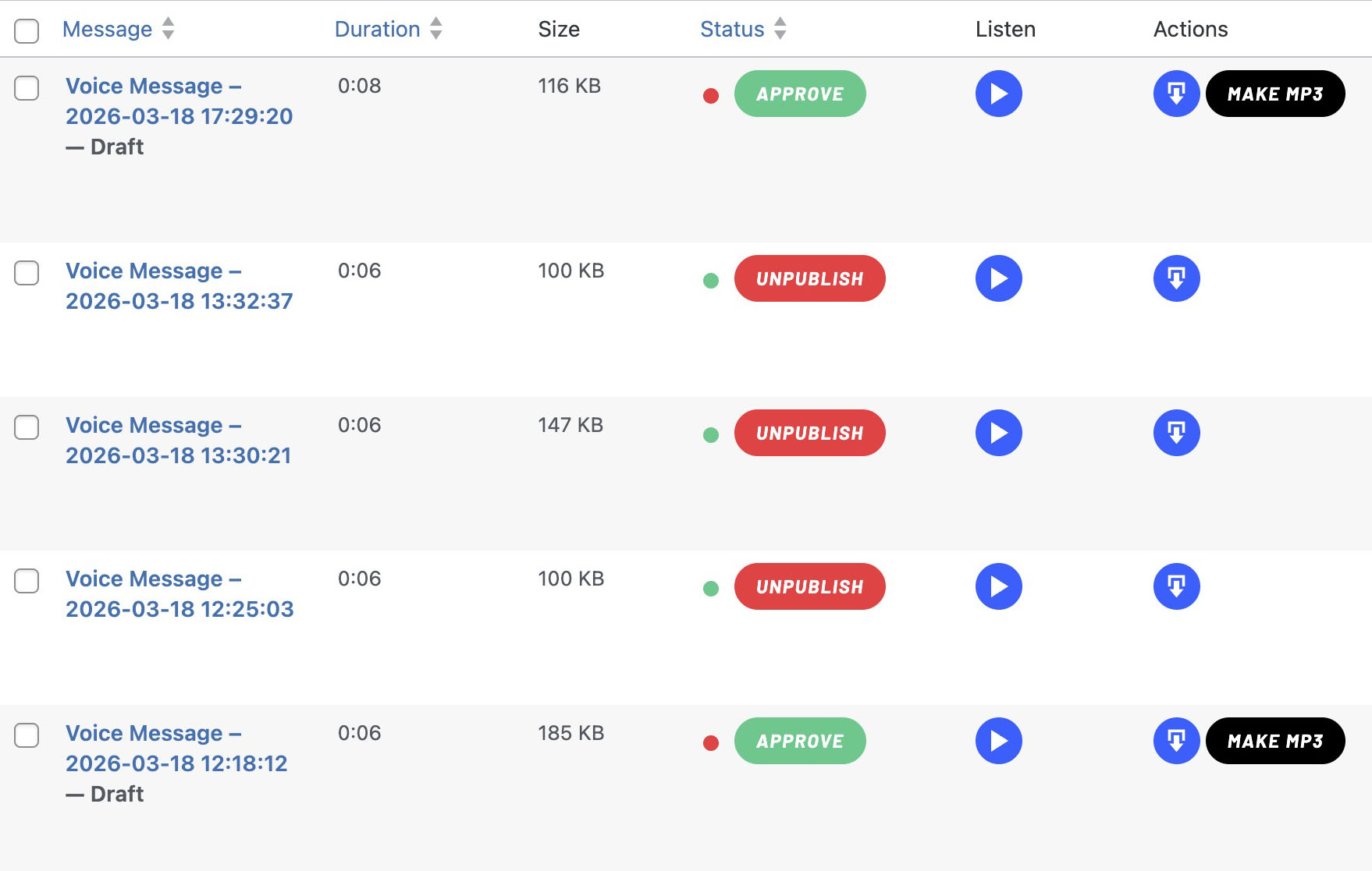 Your listeners can open the recorder, speak, review their message, and send it in seconds. Then the station manager can review it from WordPress, approve it, delete it, download it, and in Premium also convert it instantly to MP3 for immediate on-air use.