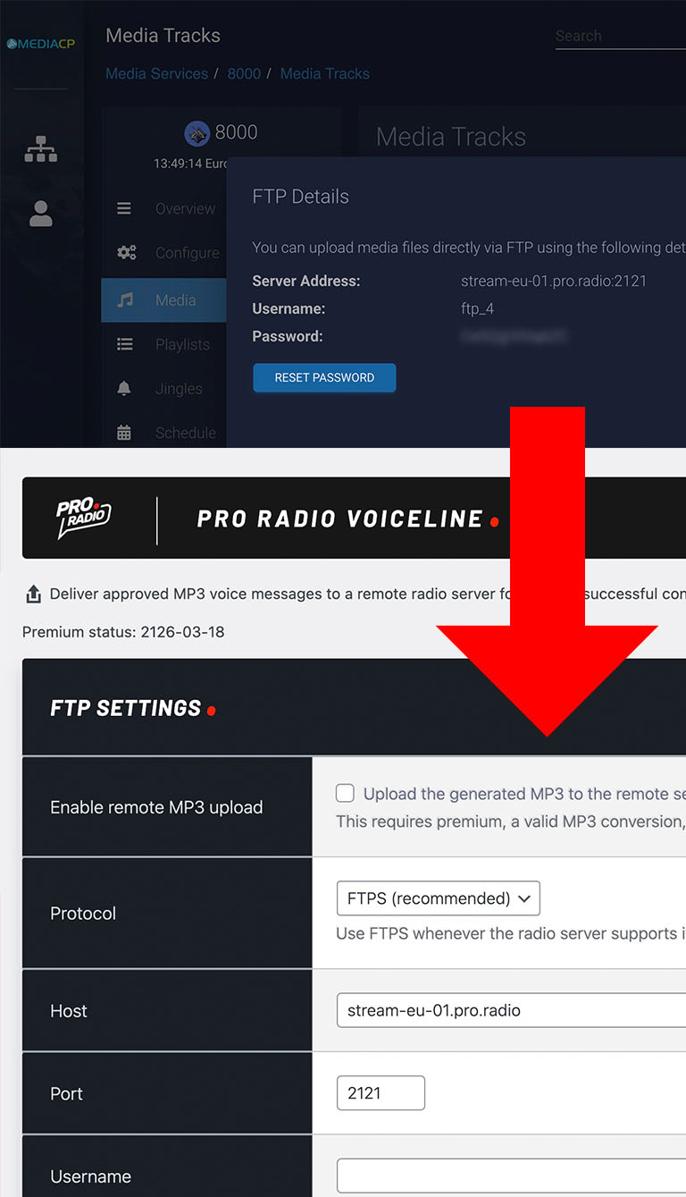 Voiceline Premium can work with platforms exposing remote upload access through FTP or SFTP. Compatible examples include SonicPanel, MediaCP, and Centova Cast for FTP-based workflows, and platforms such as AzuraCast where SFTP access is available and correctly configured.