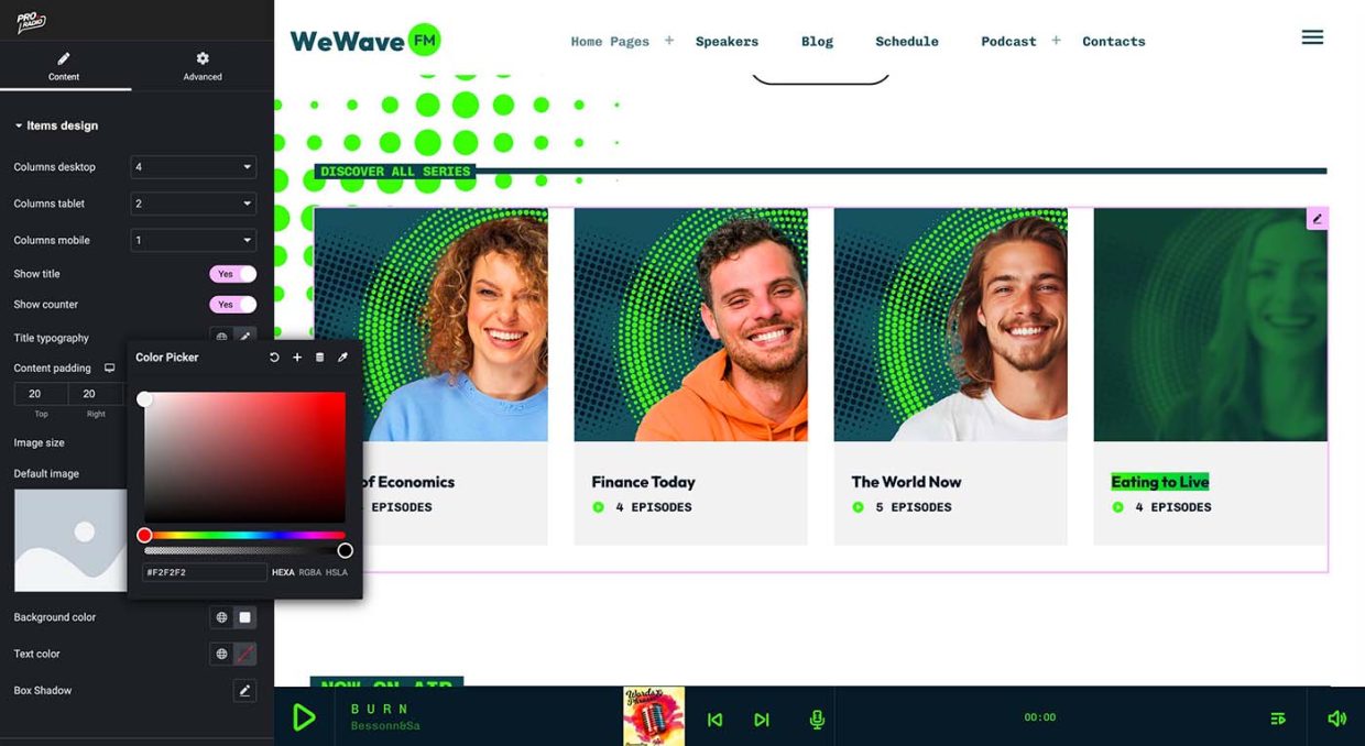 El widget de la cuadrícula de la serie de podcasts muestra todas tus series de podcasts en un diseño elegante y organizado. Es la manera perfecta de presentar tu catálogo completo de programas de un vistazo. Puedes personalizar fácilmente los colores, la tipografía y el diseño para que coincidan con la marca de tu emisora, y elegir si mostrar el título de la serie y el número de episodios.