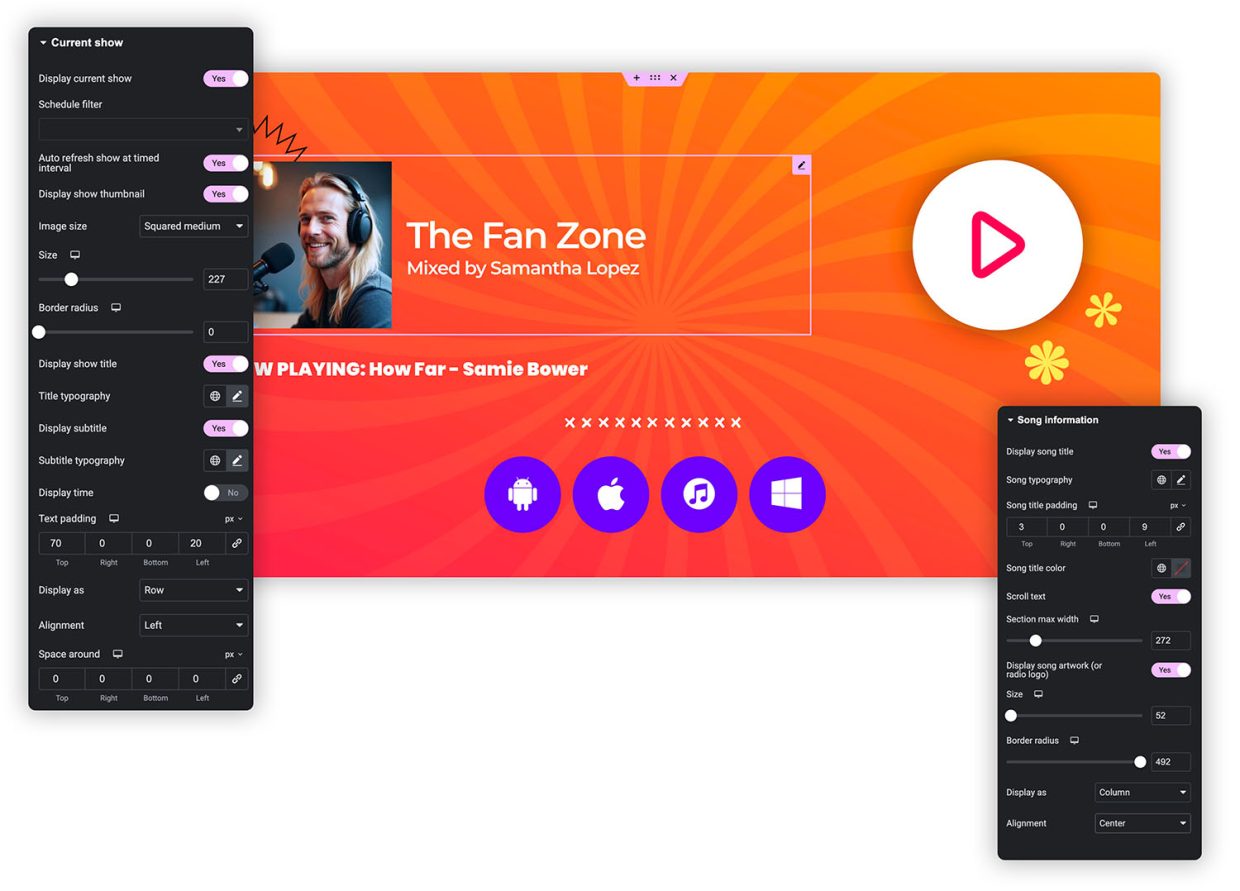 El widget del Reproductor Personalizado te da total libertad creativa para diseñar y controlar el reproductor de tu emisora exactamente como lo deseas. Conectado directamente a tu canal de radio, puede mostrar la canción que se está reproduciendo actualmente con su arte de carátula, título y artista, o mostrar detalles sobre el programa de radio actual, incluida su imagen destacada, título, subtítulo y hora. Incluso puedes combinar ambos para una experiencia de escucha completa y dinámica.