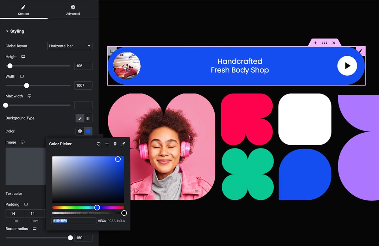 Puedes cambiar la fuente, los colores, diseñar un fondo personalizado o colocar una imagen en su lugar, y colocar tu logotipo para crear un reproductor de radio vibrante y profesional.
