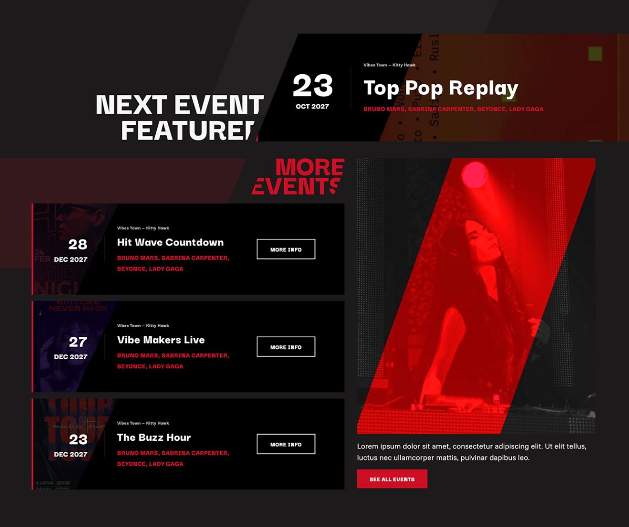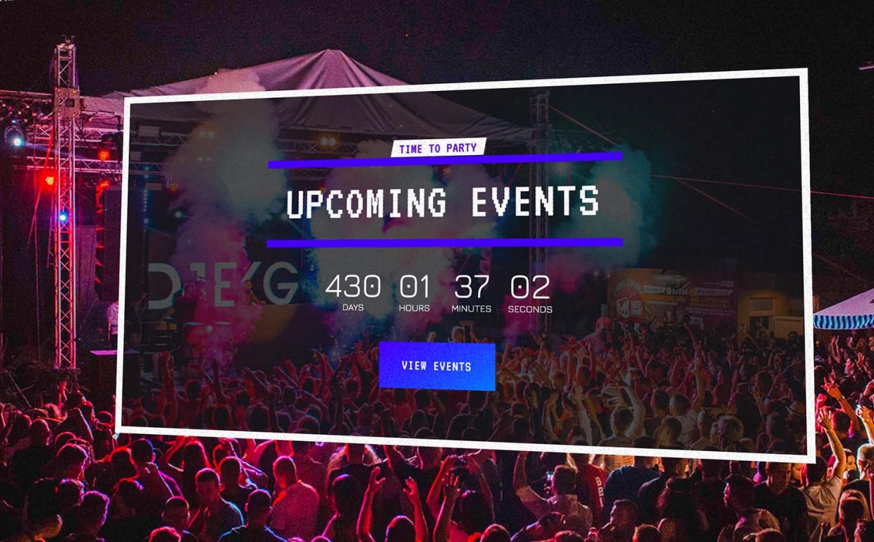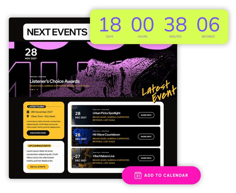 Agrega eventos como eventos destacados, lista de eventos, tarjetas de eventos, carruseles y cuentas regresivas.