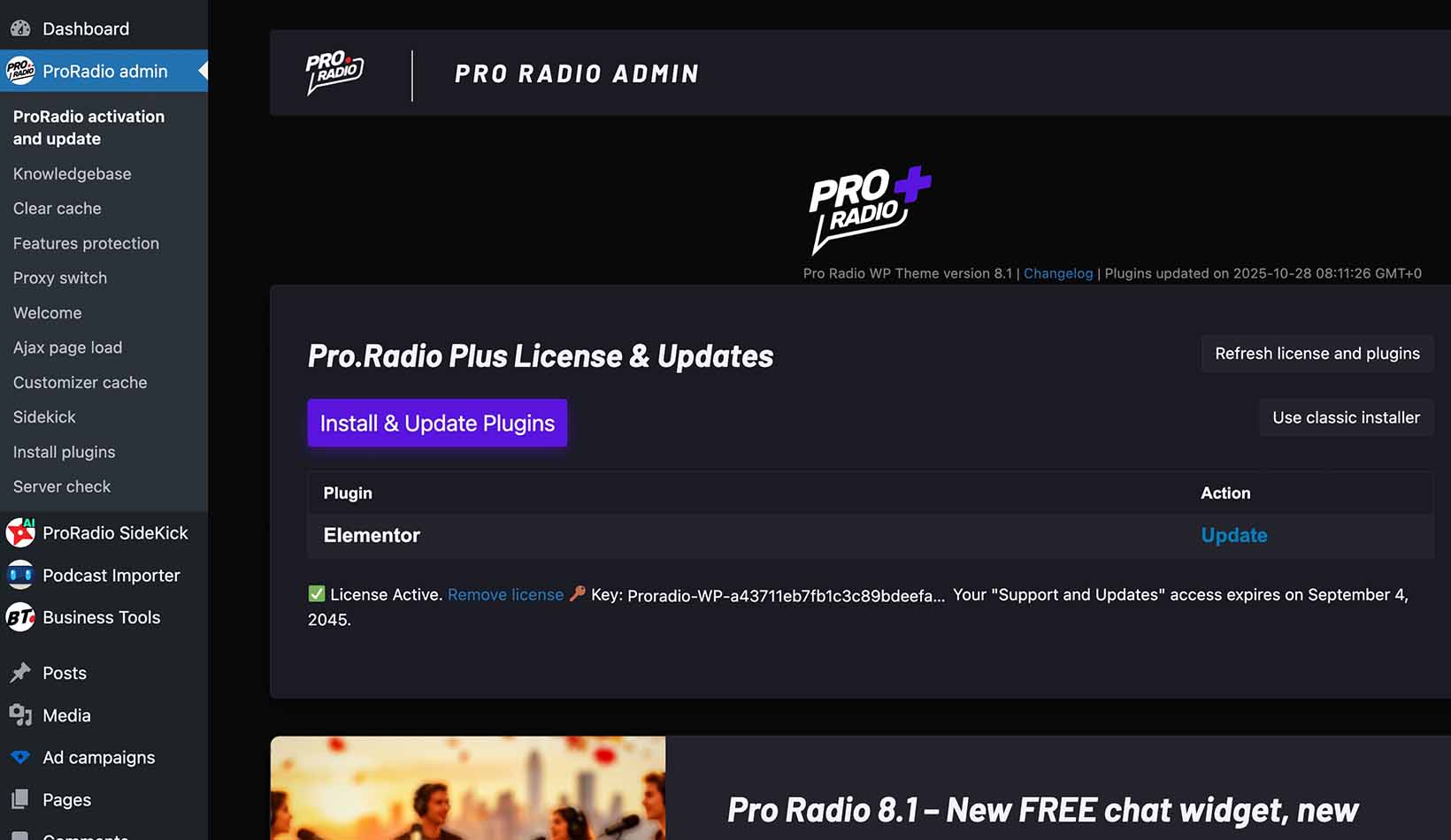 Cambiar de Pro Radio WP Plus a Pro Radio WP estándar desactivará suavemente las funciones de los plugins y las plantillas de Elementor que son parte del paquete Pro Radio Plus.