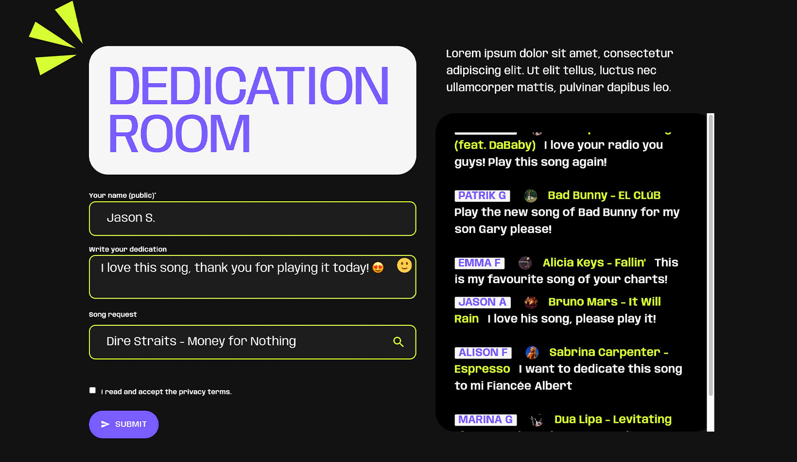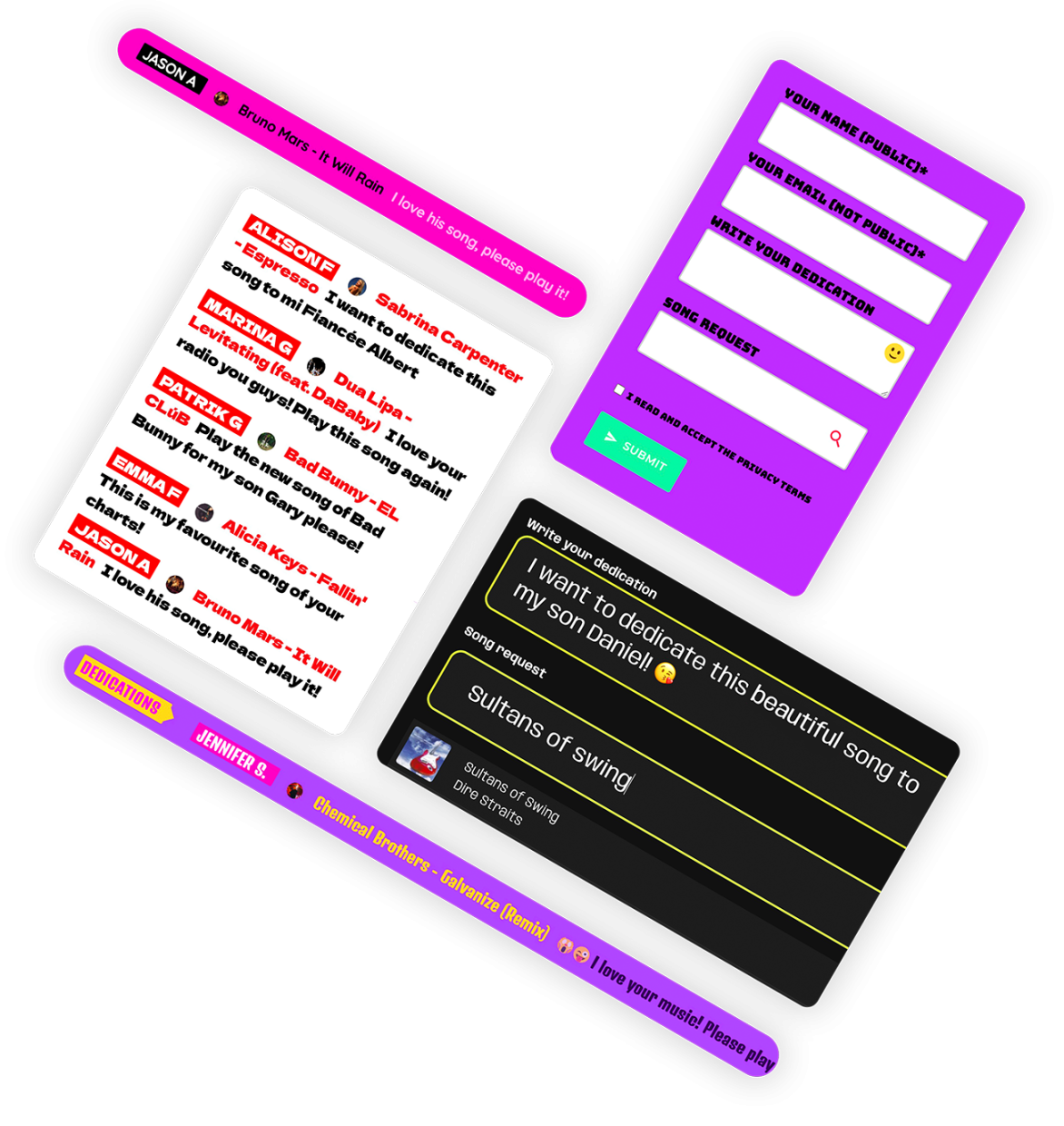 Los oyentes pueden enviar solicitudes de canciones y mensajes con herramientas de protección contra el spam y moderación.