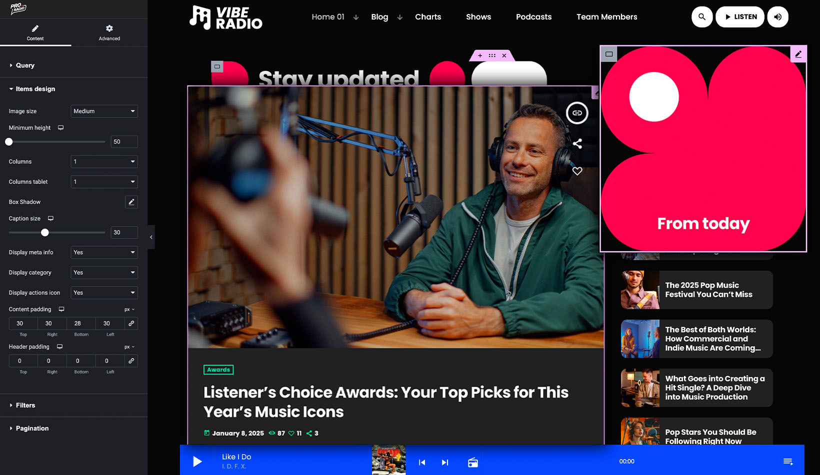 Crea cada página visualmente con más de 50 widgets personalizados de Elementor para emisoras de radio. Incluye un montón de demostraciones listas para usar.