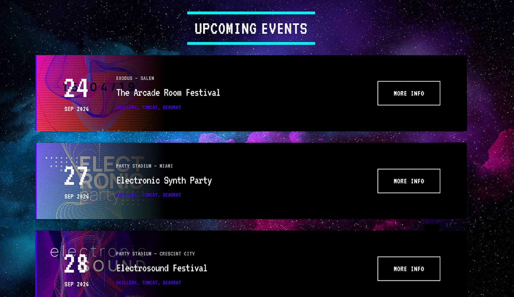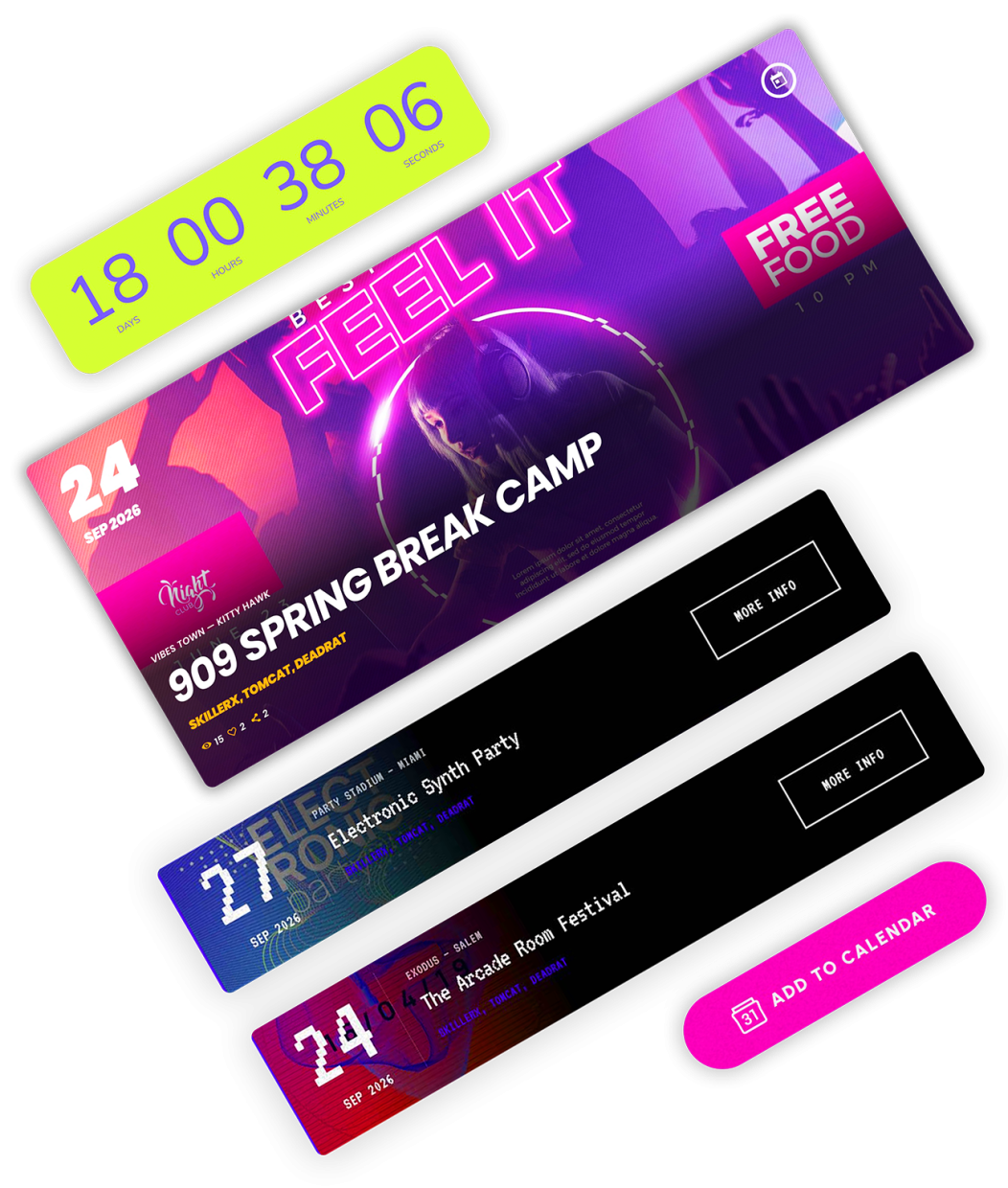 Promociona conciertos o retransmisiones con la fecha, el lugar y enlaces para comprar entradas. Muestra la lista de eventos y las cuentas atrás con un solo clic.