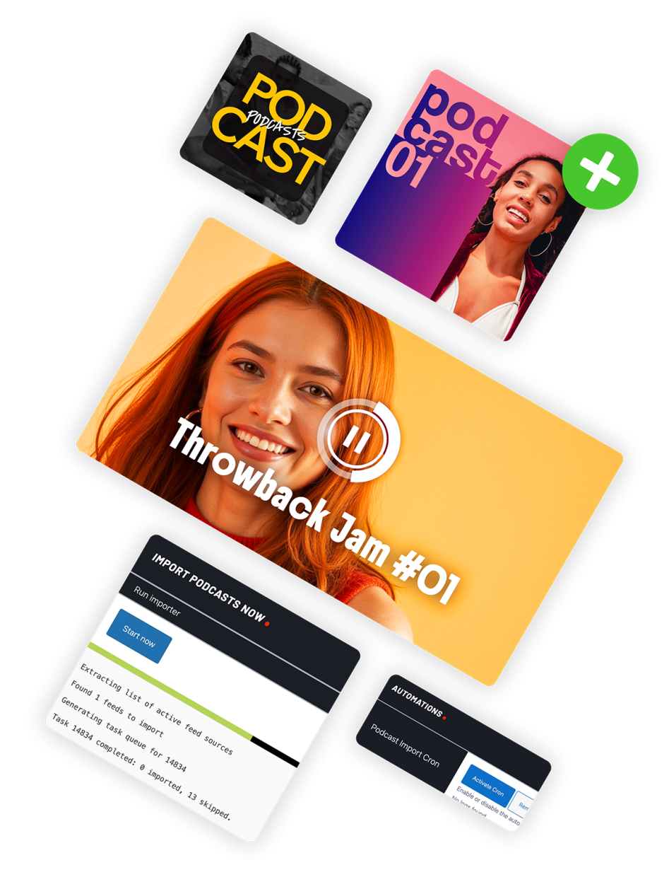 Importa, publica y organiza episodios de podcast con reproductores de audio integrados. Compatible con RSS, MP3, Mixcloud...