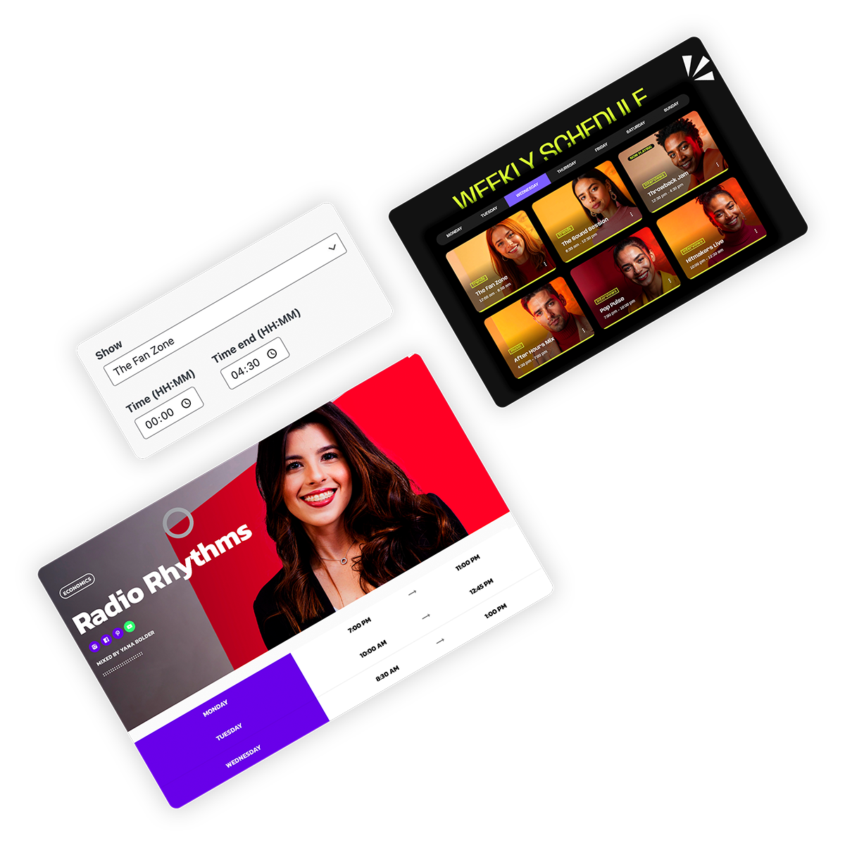 Crea páginas de DJ y presentadores con biografías, fotos, programas y enlaces a redes sociales. Vincula fácilmente a los locutores con los programas de radio.