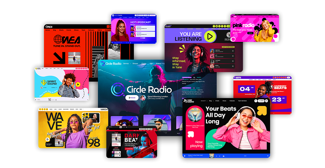 Edita una de las 43 plantillas de página de radio listas para importar y comienza la página web de tu radio al instante.