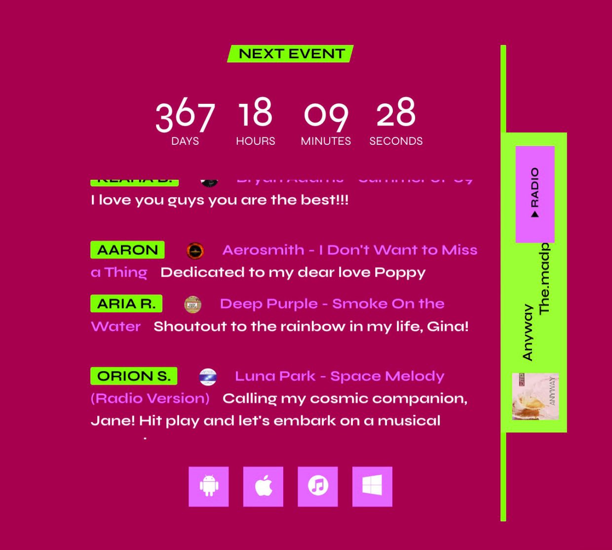 Mostra l’amore e l’interazione del tuo pubblico in tempo reale con il widget Lista Dediche. Questo elemento dal vivo visualizza le dediche inviate dai tuoi ascoltatori in un layout di lista pulito e dinamico, creando un senso di comunità e coinvolgimento sul sito web della tua radio.