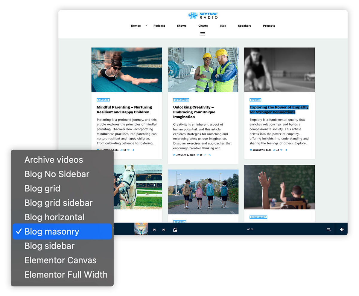 Il Tema WordPress Pro.Radio ha 6 layout di blog integrati tra cui puoi scegliere.