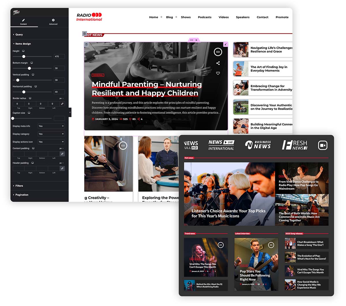 Puoi anche costruire una pagina blog completamente personalizzata in stile Magazine utilizzando solo Elementor e la moltitudine di Elementi per il blogging aggiunti dal Tema WordPress Pro.Radio.