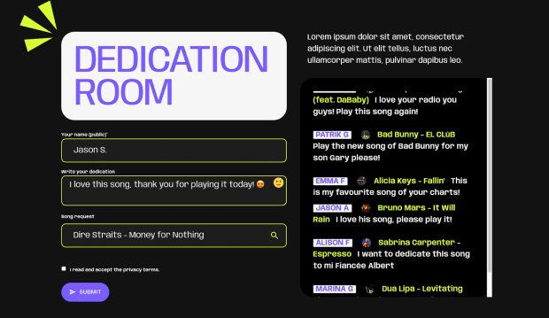 Gli ascoltatori possono inviare richieste di canzoni e saluti con strumenti di protezione antispam e moderazione. Ricerca automatica dei brani e completamento automatico.