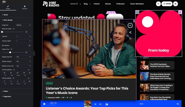 Crea ogni pagina visivamente con oltre 50 widget Elementor personalizzati per stazioni radio. Tante demo incluse pronte all'uso.