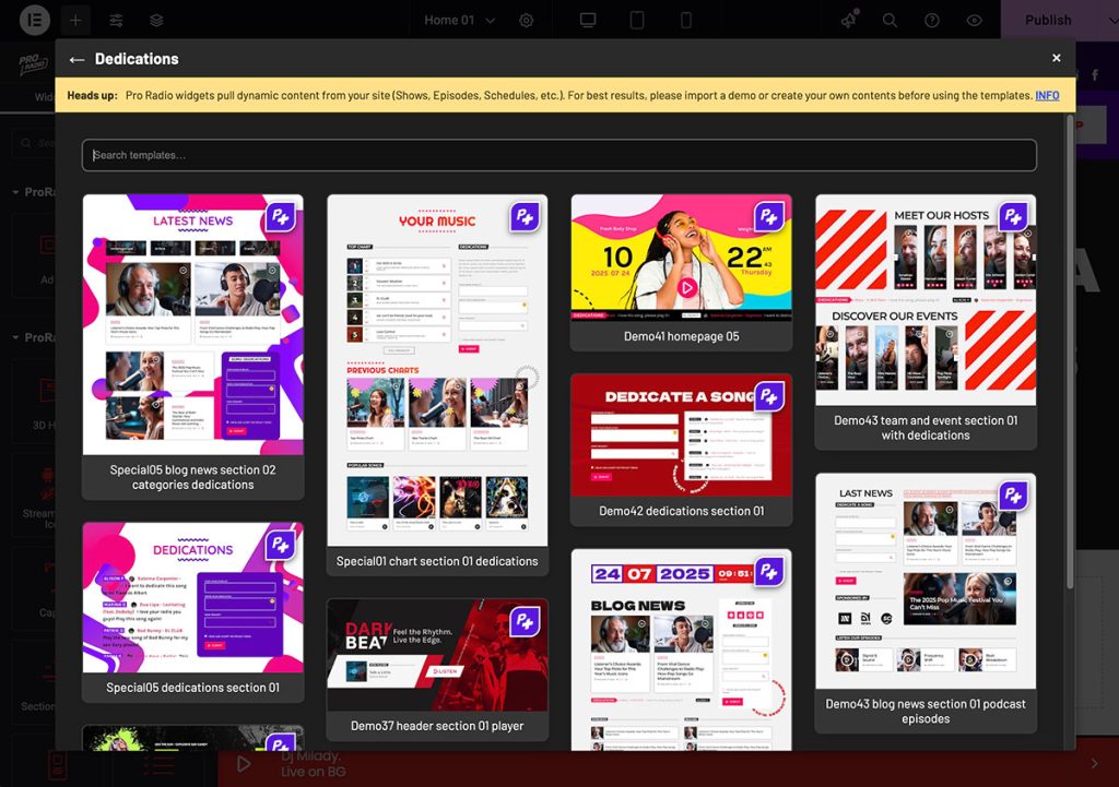 On top of the 43 prebuilt websites included with Pro Radio, Pro Radio Plus includes over 300 new Elementor templates that you can import on any website.