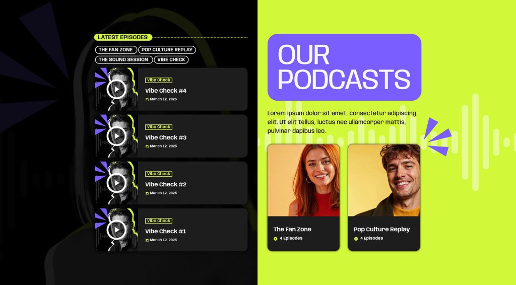 - Podcast Support – Upload and organize episodes for on-demand listening, making your content available 24/7.