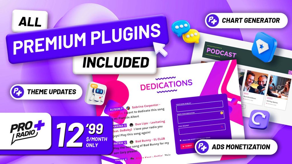Your station deserves a website that’s as dynamic as your broadcast. With Pro Radio and now Pro Radio Plus, you don’t just get a theme—you get a professional toolkit built for radio. Whether you’re focused on broadcasting, podcasting, or internet radio, you’ll find everything you need to create a powerful online presence.