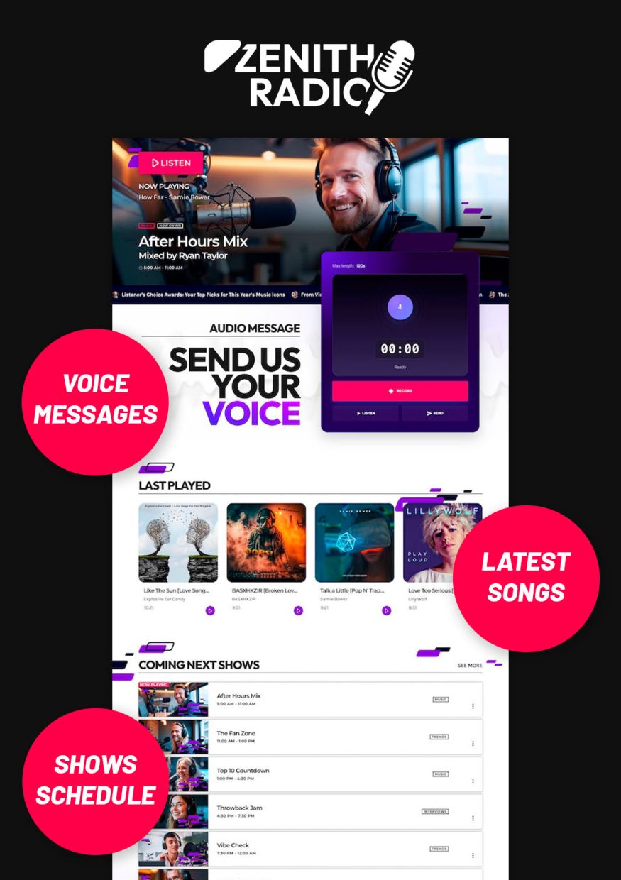 Zenith Radio templates also include Voiceline, a powerful new feature designed to bring your audience closer to your station. With Voiceline, listeners can send voice messages directly to your website — creating real interaction between your internet radio and its community.