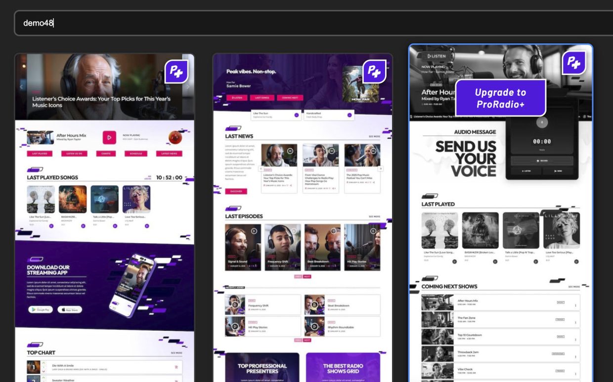 One of the biggest advantages of Pro Radio Plus is efficiency. Instead of installing a completely new radio website template every time you want a different design, you can import only the templates you love.