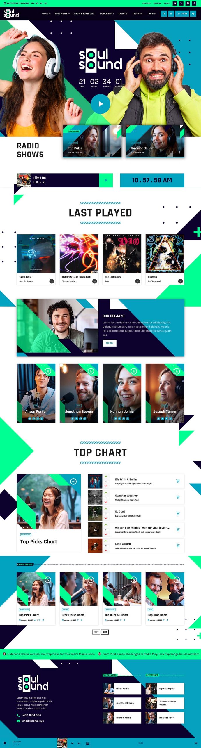 If you’re building a professional online presence for your webradio or internet radio station, Soul Sound gives you a clean, modern canvas to share your voice with the world. Designed with blue, teal, and white tones and elegant Rajdhani and Karla fonts, this radio website template delivers clarity, personality, and ease of use — perfect for talk shows, news broadcasters, podcasts, and community radio.