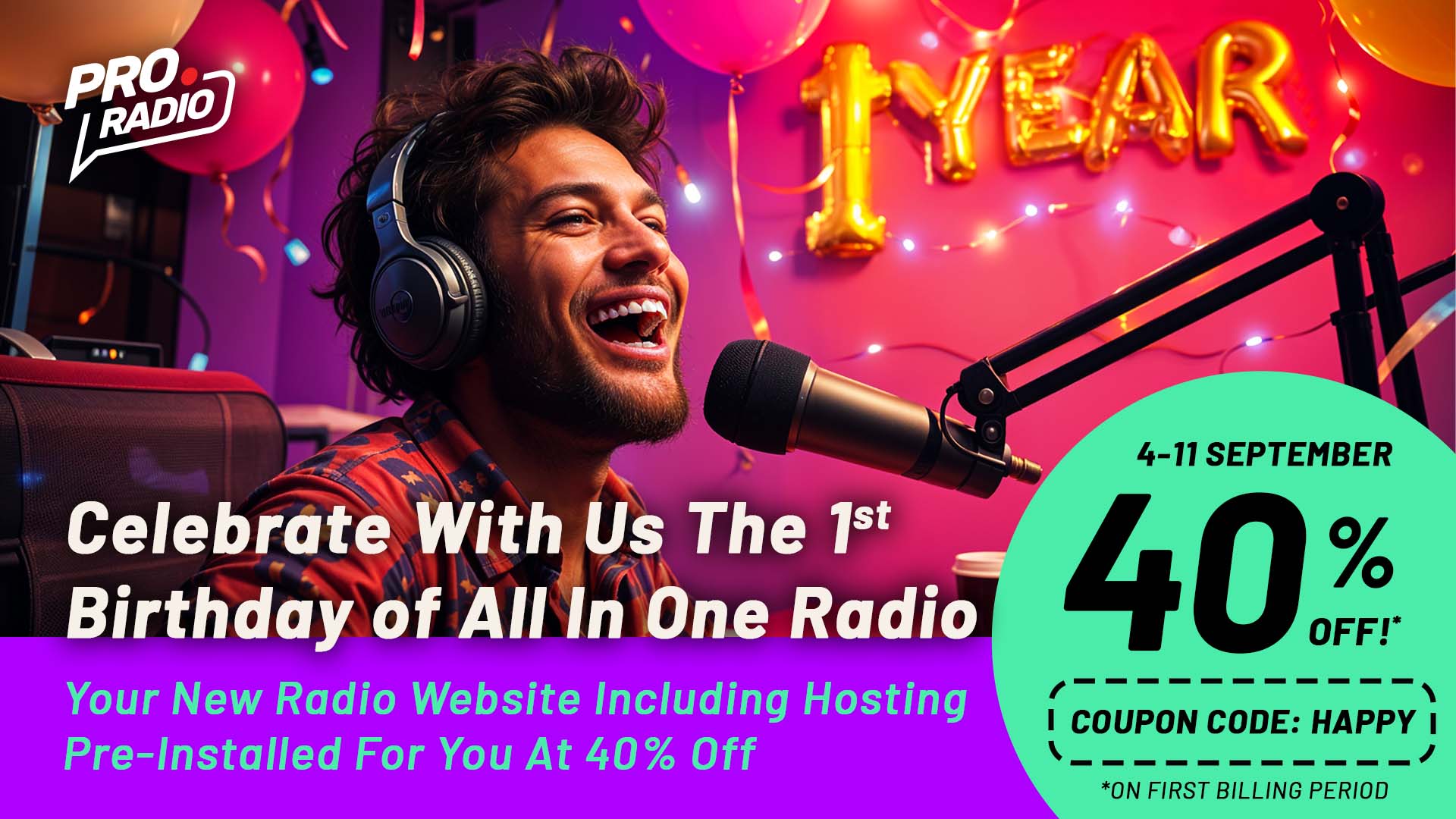 Hello dear radio lovers! A year ago, we launched our comprehensive All-in-One Radio Website—the first and only fully integrated radio station website package. To celebrate our first anniversary, we’re excited to offer you an incredible 40% discount on the first billing period for any All-in-One Radio package (any template, any billing period)!