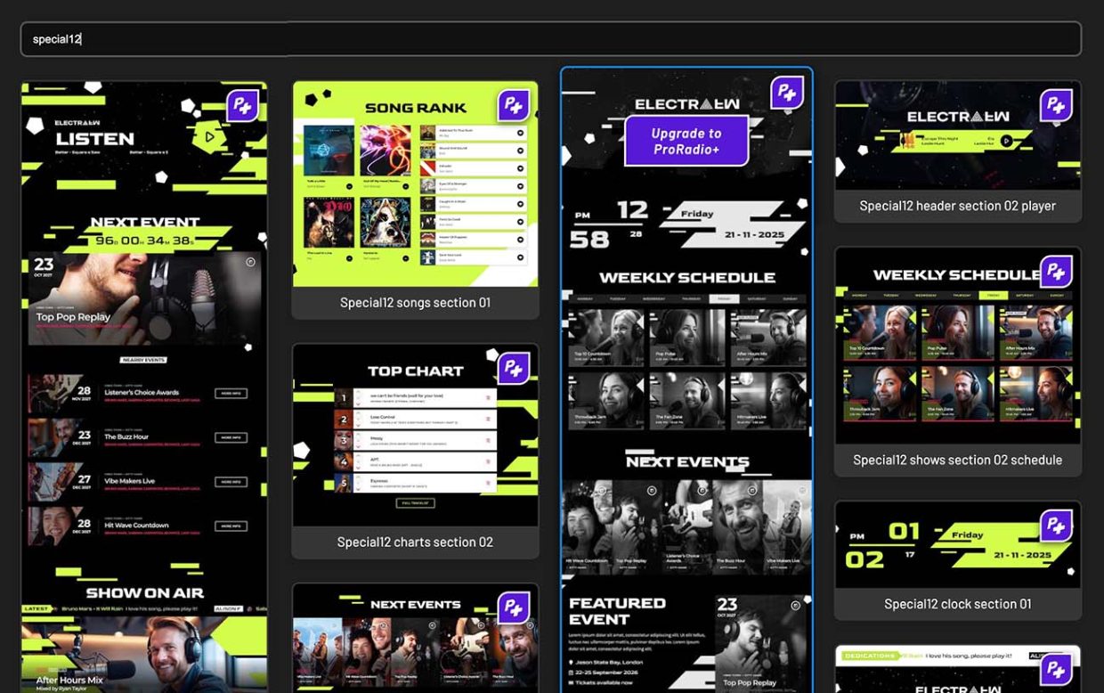 These new exclusive Elementor templates for Pro Radio Plus are designed for radio stations that want a bold, futuristic identity. Built around a black and green techno-cyber style, glitchy decorations, and strong interactive sections, they are perfect for webradio, internet radio, podcasting, and live broadcasting websites.