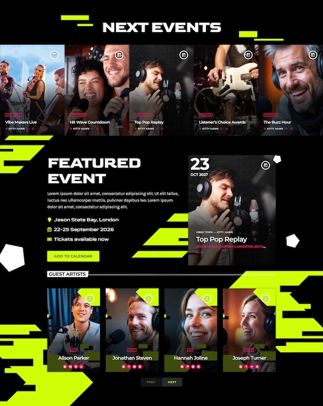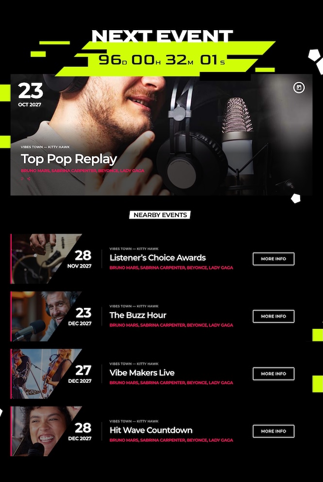 Right after the hero, a featured upcoming event is highlighted with a live countdown timer, followed by a list of nearby or upcoming events. This is ideal for radio stations that promote shows, DJ sets, or live broadcasts.