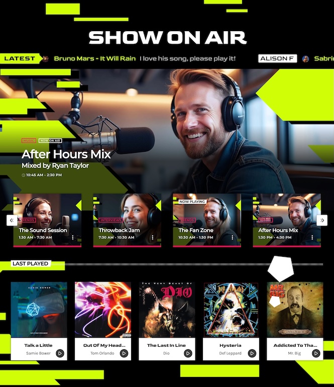 The page opens with a shows slider and live player, showcasing your programs while keeping playback always accessible.