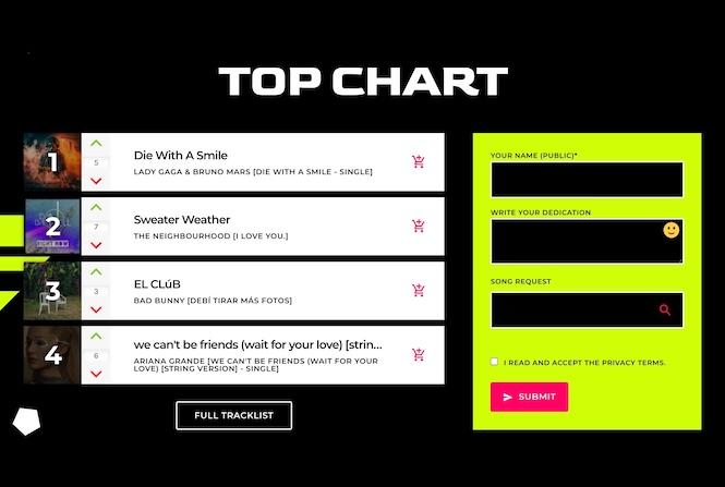 The page continues with a Top Chart section featuring the top 4 tracks, combined with a Pro Radio Dedications form that allows listeners to send messages directly from your radio website — a proven way to boost interaction and loyalty.