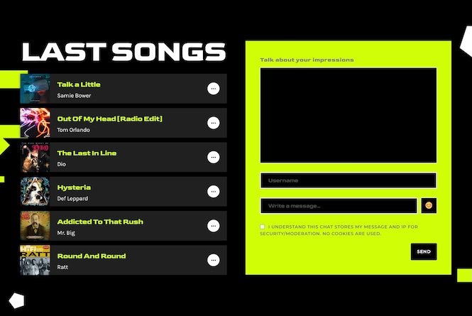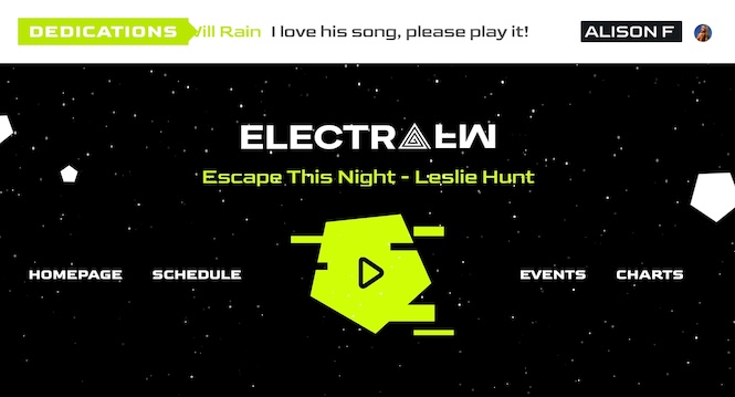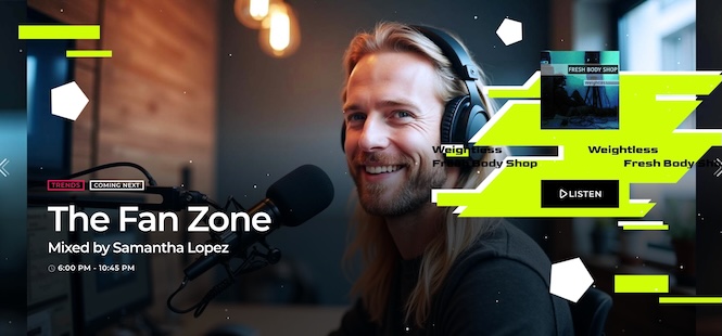 The page starts with a clean header featuring your logo and radio player, enhanced by a video background that adds atmosphere and energy without distracting from the listening experience.