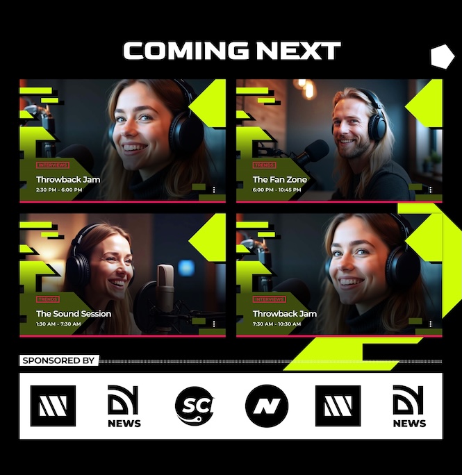 A Coming Next grid previews upcoming shows, paired with a sponsors carousel — perfect for monetization and partner visibility.