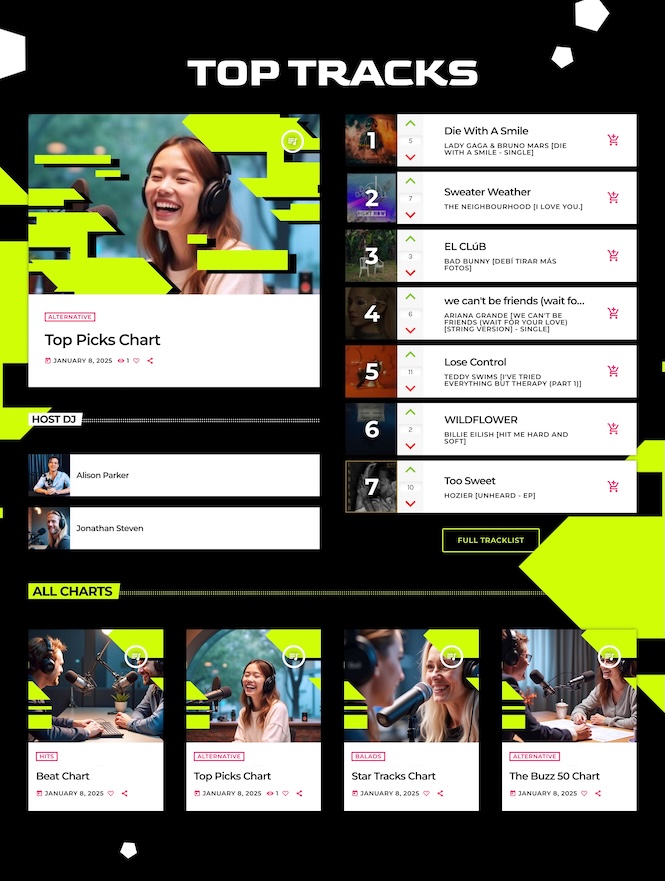 This combination of podcasting and curated charts makes Homepage 03 perfect for radio stations that blend broadcasting, internet radio, and podcasting into one powerful and engaging radio website experience.
