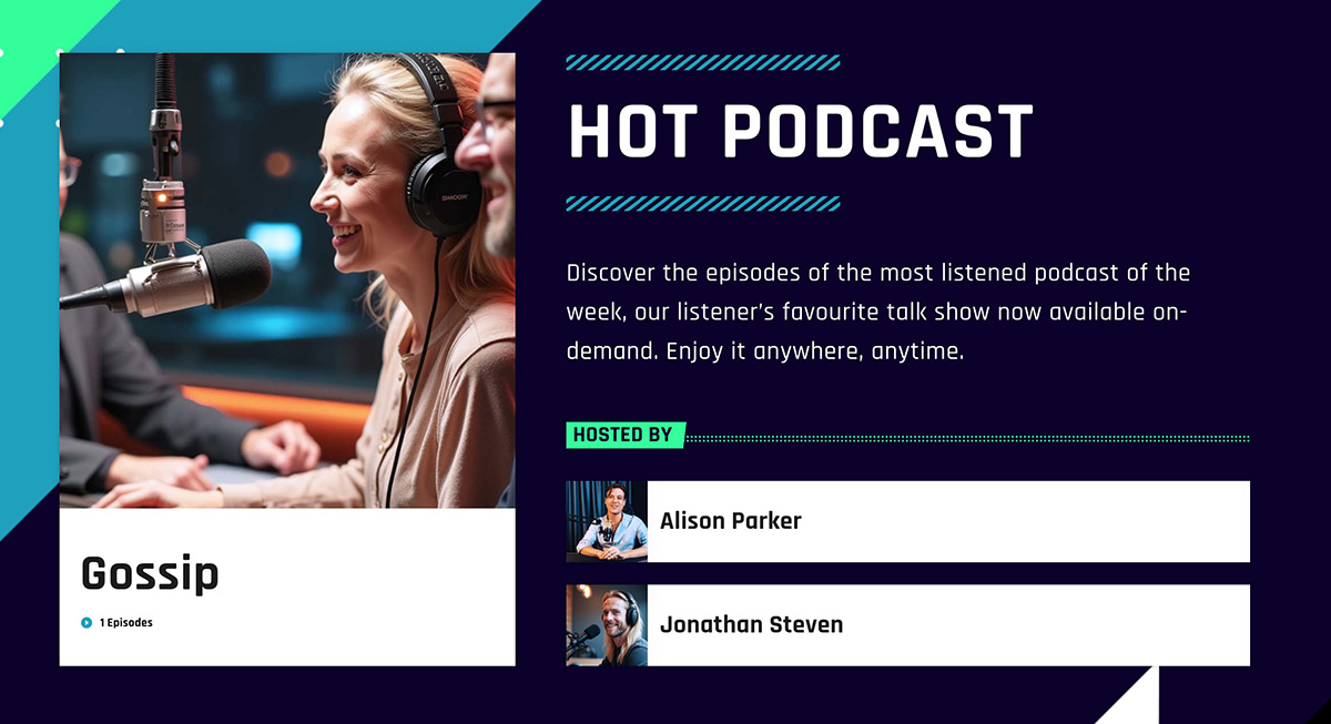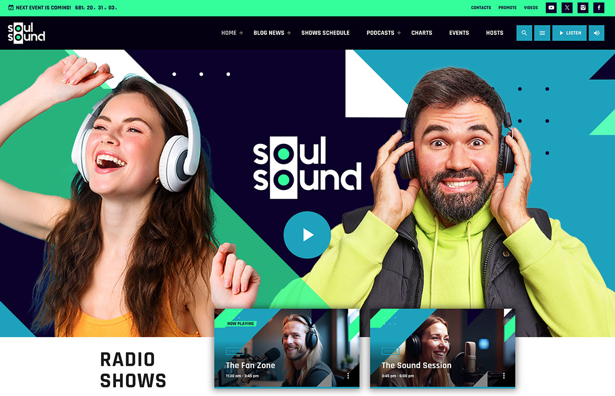 Soul Sound puts content first. The balanced color palette and readable typography make it easy for listeners to find exactly what they’re looking for — from live shows to the latest episodes and news updates.