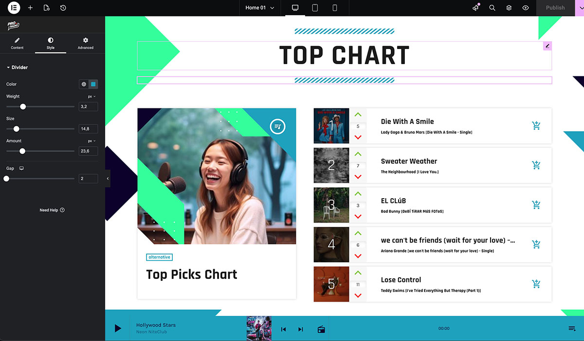 This radio website builder template works with Elementor, so you can drag and drop content blocks, customize colors, and rearrange layouts with zero coding. Make Soul Sound truly yours in minutes — not days.