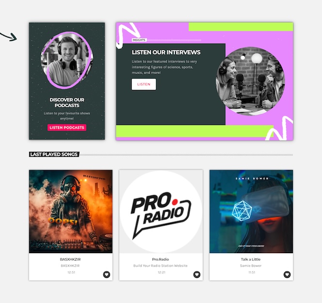 - Two cards presenting the radio’s highlights and Last played songs grid to keep music lovers engaged