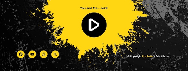 This bright and modern footer comes with a large play button, on-air song information, social links, and copyright text, creating a consistent, professional look across your entire site.