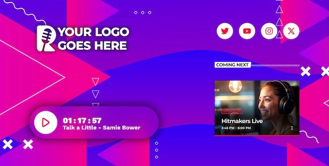 A bold splash-style header with a vibrant color background, station logo, social media icons, and an integrated player. This section works great as a homepage hero or landing intro, making it easy for listeners to recognize your brand and start listening instantly.