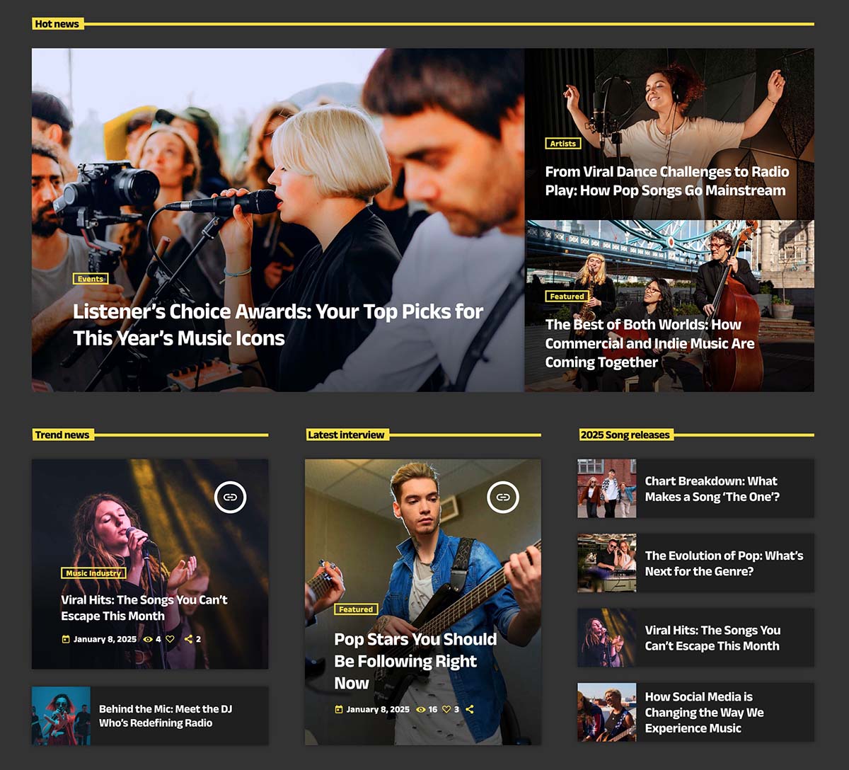 The first homepage delivers a full radio website template experience inspired by modern digital magazines. A strong featured section introduces your top content, followed by a live player and dynamic content blocks for news, podcasts, and charts.