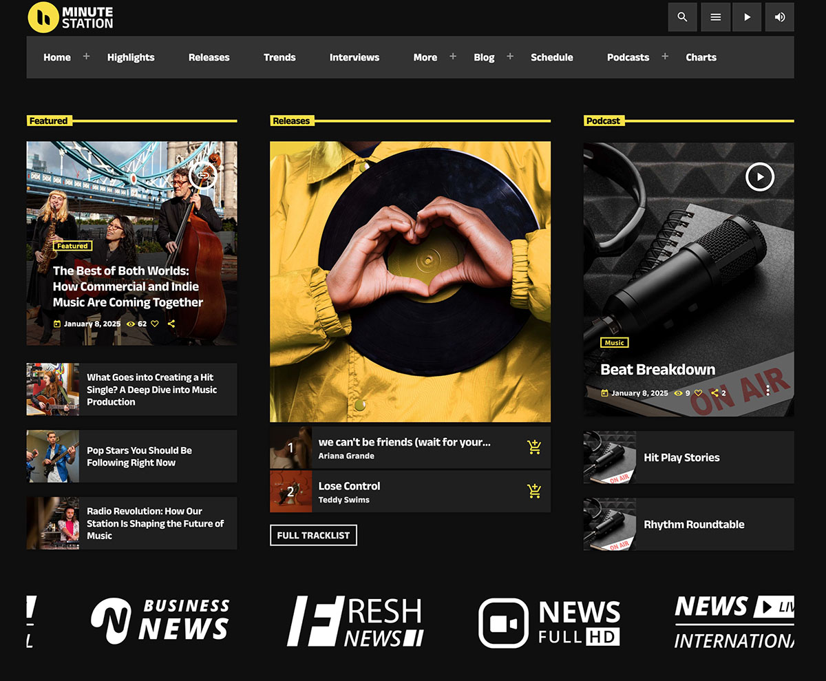 This layout is perfect for stations that want to combine broadcasting with editorial storytelling, offering a balanced mix of audio and written content.