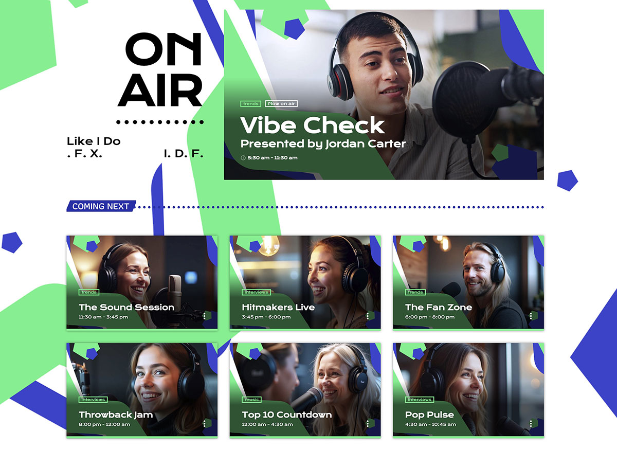 This layout makes it easy to present your core content — from breaking news and talk shows to music playlists and spotlight segments — all in a visually cohesive way.