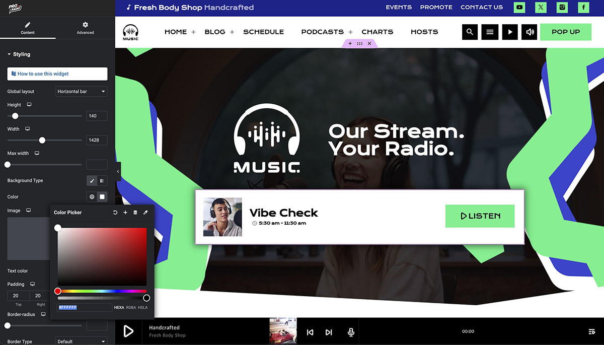 You’re in control of how your site looks and feels. With Pro Radio’s intuitive settings and support for Elementor, My Music FM lets you customize every detail — no coding required.