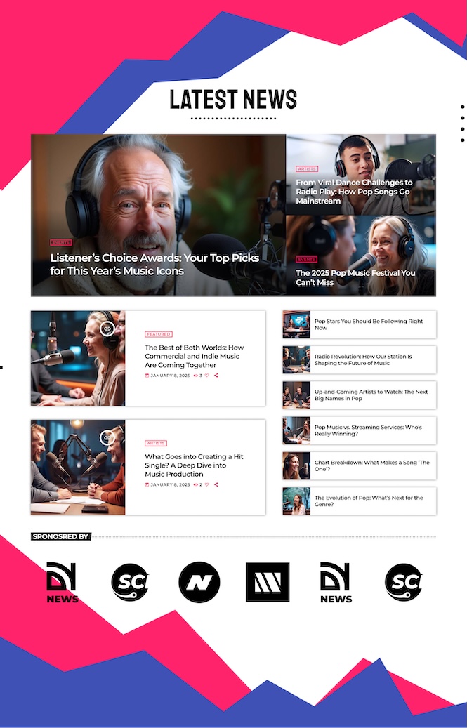 Turn your radio into a media brand. This modern news layout allows you to publish: