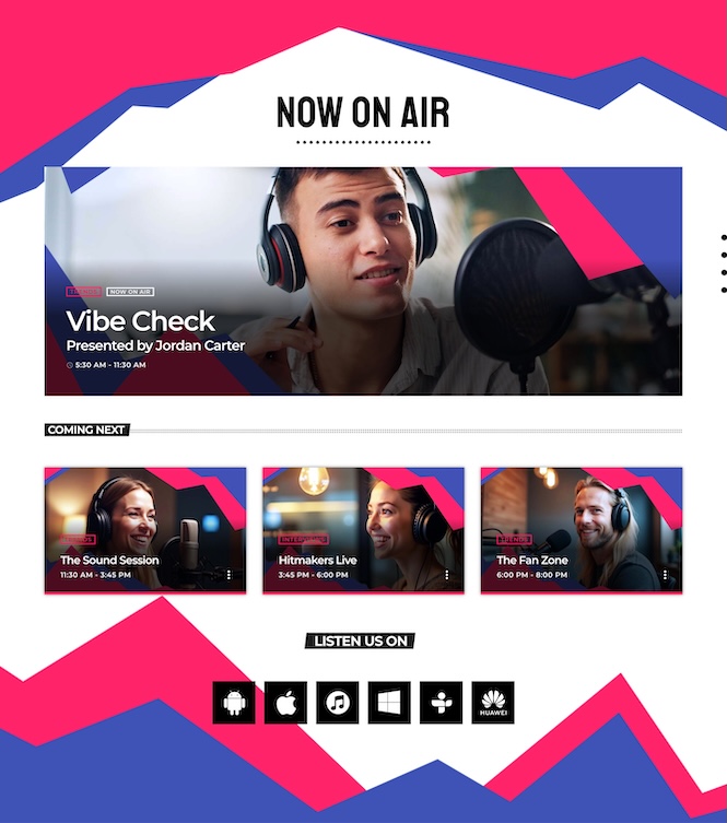 A bold card layout highlights the current show and track. It’s clean, modern, and built for fast engagement.