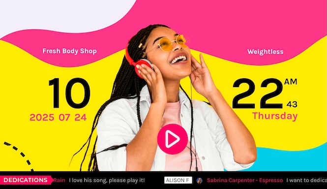 Kick off your radio experience with a burst of energy using this dynamic splashpage template. Featuring a large clock, a bold play button, and the current song title, it instantly captures your listeners’ attention. The dedications scroller adds a personal touch, keeping your audience connected in real time. It’s the perfect landing page to make a great first impression.