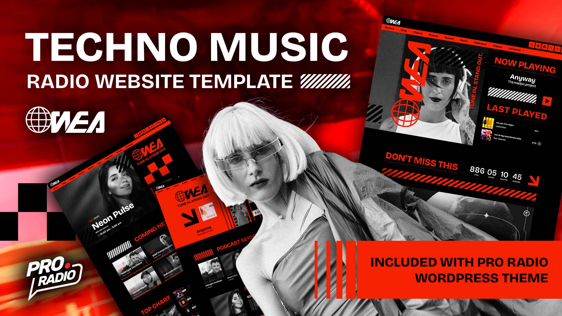 If your sound is raw, pulsating, and underground — your radio website should reflect it. WEA Radio is the definitive WordPress template for techno, house, EDM, and electronic music radio stations. Built with a brutalist design approach, powered by the Pro Radio WordPress Theme, and infused with a bold red and black visual identity, WEA Radio is more than a template — it’s a visual and functional extension of your station’s energy.