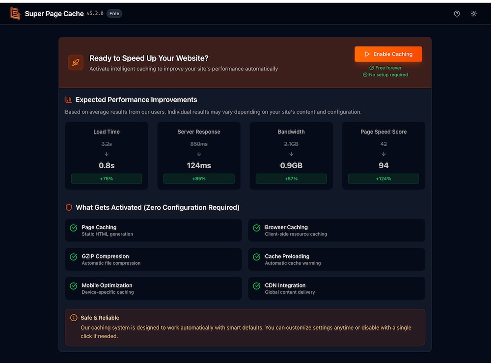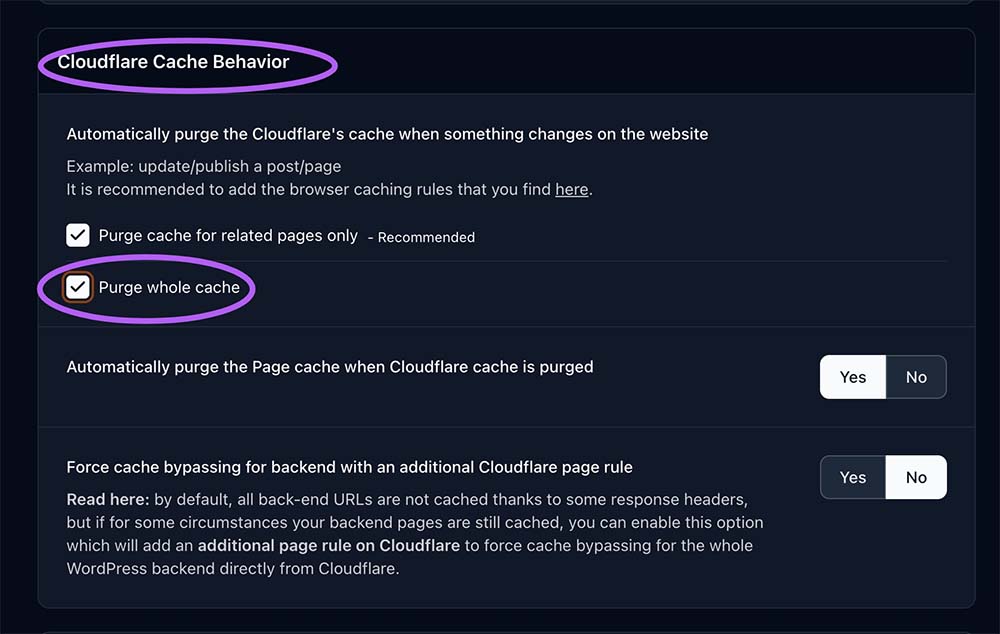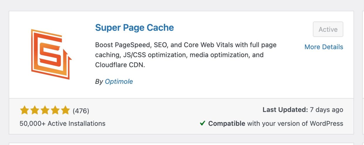 Once Cloudflare is set up, we need to configure caching parameters. Install the “Super Page Cache” plugin and link it to your Cloudflare account using the API key.