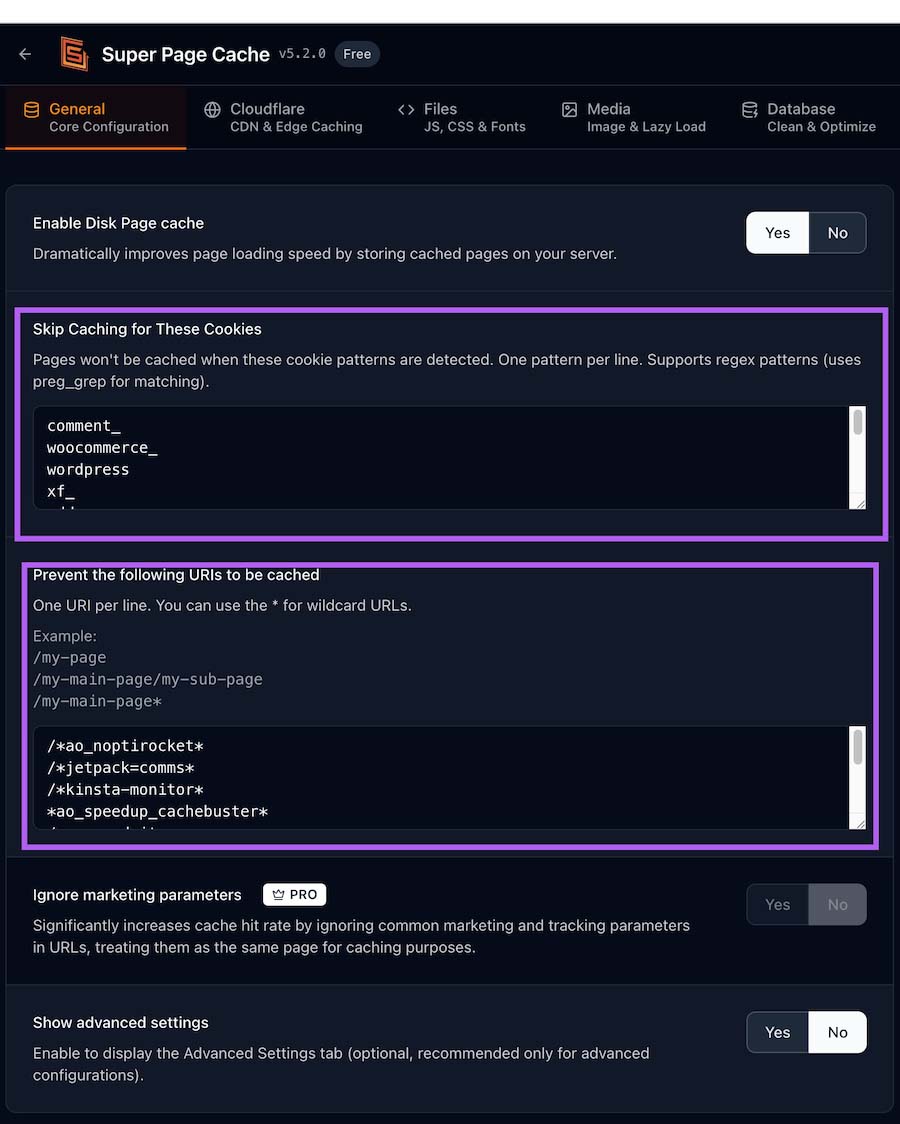 Now from the left menu open the Super Page Cache > Settings and set the correct exclusion rules: